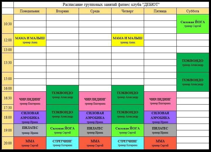 По поводу расписания вы можете получить подробную информацию у администраторов фитнес-клуба Дебют. И обязательно обговорите с ними или вашим тренером важные нюансы допустимых и нежелательных нагрузок. Мы создаём все условия, чтобы вы были здоровыми и сильными!